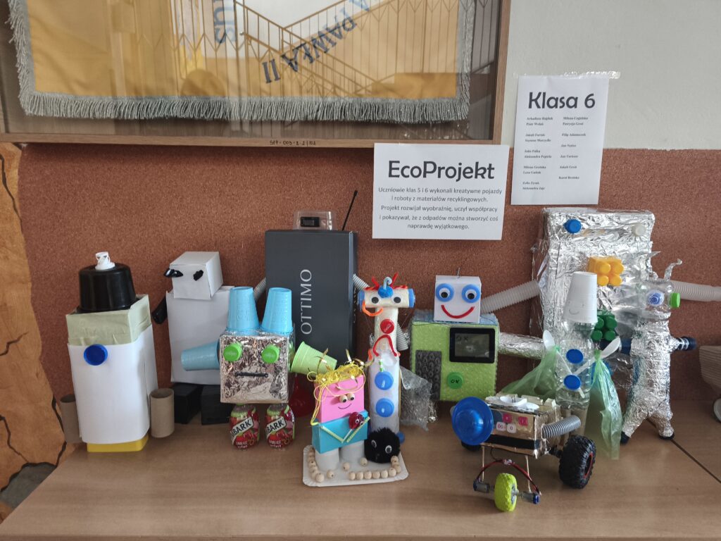 W klasach piątych i szóstych zrealizowano EkoProjekt w ramach lekcji techniki. Uczniowie, pracując w grupach, tworzyli kreatywne pojazdy i roboty z materiałów recyklingowych, takich jak pudełka, butelki, rolki czy różnego rodzaju opakowania. Działanie to nawiązywało do szkolnych treści dotyczących recyklingu, zasad racjonalnej gospodarki odpadami oraz świadomego wykorzystywania surowców wtórnych.