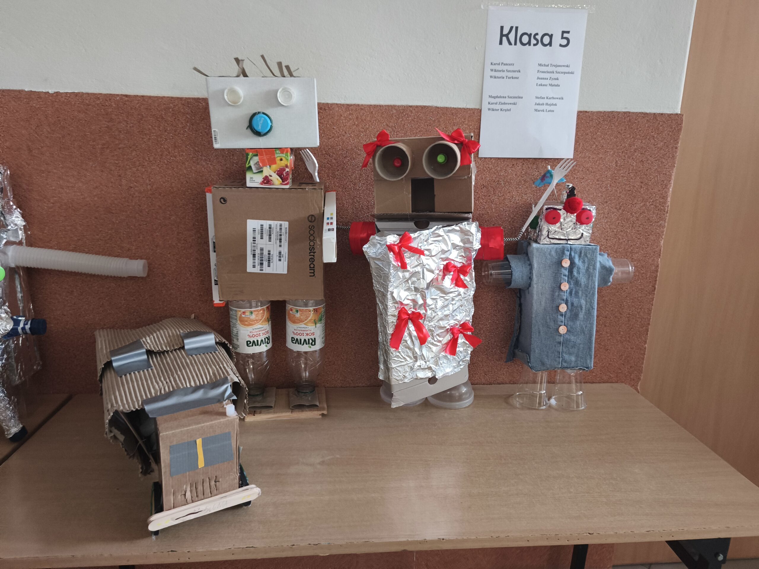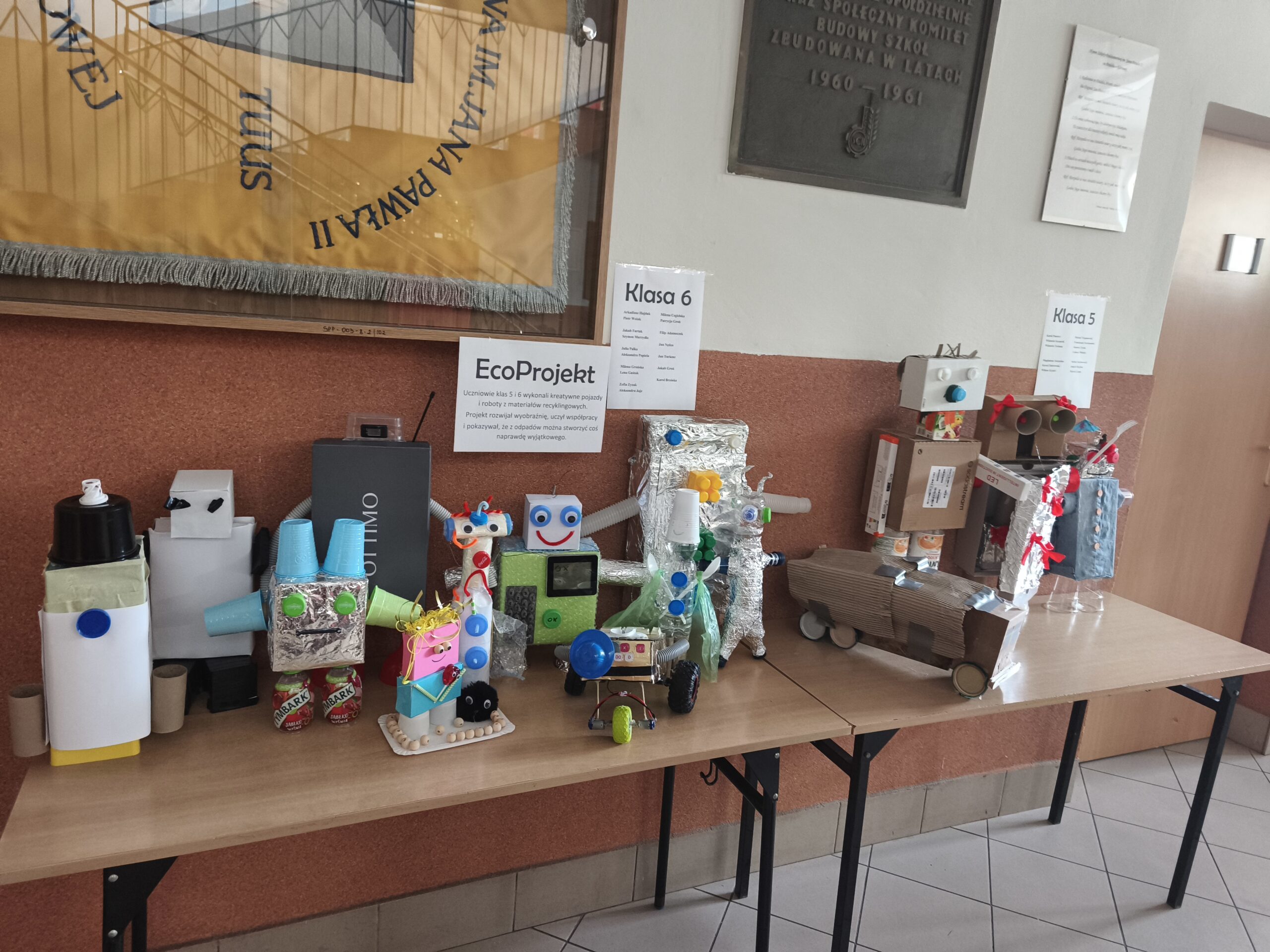 W klasach piątych i szóstych zrealizowano EkoProjekt w ramach lekcji techniki. Uczniowie, pracując w grupach, tworzyli kreatywne pojazdy i roboty z materiałów recyklingowych, takich jak pudełka, butelki, rolki czy różnego rodzaju opakowania. Działanie to nawiązywało do szkolnych treści dotyczących recyklingu, zasad racjonalnej gospodarki odpadami oraz świadomego wykorzystywania surowców wtórnych.