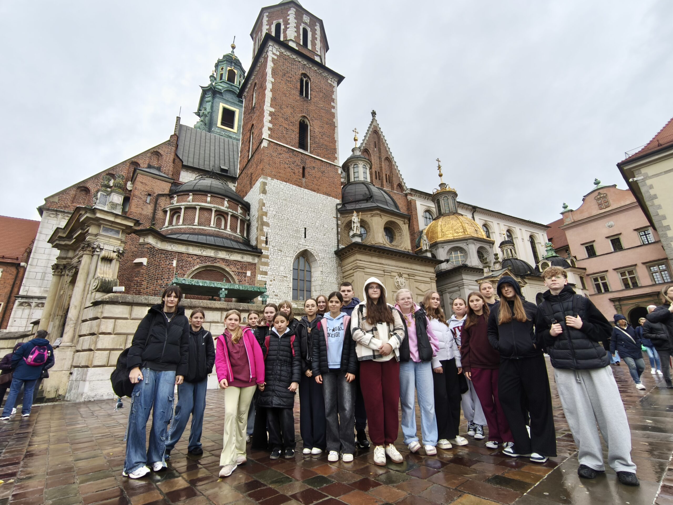 10 października 2025 roku 45 uczniów naszej szkoły wraz z opiekunami- Paniami: Beatą Hołysz, Barbarą Obłończyk i Bożeną Ziobrowską- wzięło udział w wycieczce do Krakowa zorganizowanej przez Małopolską Organizację Turystyczną z siedzibą w Krakowie w ramach projektu „Poznaj Małopolskę”. Pierwszym punktem wyjazdu były zajęcia w Małopolskim Centrum Nauki Cogiteon, gdzie uczniowie mogli samodzielnie zgłębiać tajniki z różnych dziedzin, korzystając z niezwykle ciekawych, interaktywnych stanowisk. Następnie, już z przewodnikami i podzieleni na dwie grupy, mieli okazję zobaczyć zabytki dawnej stolicy Polski. Przeszli szlakiem zabytków romańskich- zobaczyli kościoły św. Andrzeja i św. Wojciecha; najstarsze budowle sakralne w Polsce, które zachwycają swoją prostotą i monumentalnością. Spacerując po Wzgórzu Wawelskim uczestnicy mogli poczuć atmosferę, w jakiej żyli polscy królowie. Katedra Wawelska – obiekt kultu oraz symbol polskiej historii i tożsamości- była miejscem, gdzie uczniowie mieli szansę poszerzyć swoją wiedzę na temat władców polskich. To był niezwykły dzień, nauka połączona z zabawą. Dziękujemy Pani Dyrektor za zgłoszenie szkoły do projektu.